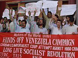 14 de septiembre 2008. - Estudiantes pakistaníes salieron a las calles de Quetta a protestar a en contra del gobierno de Estados Unidos y en apoyo al presidente Hugo Chávez en su decisión de expulsar al embajador norteamericano, Patrick Duddy.