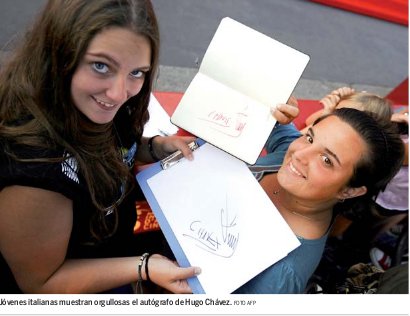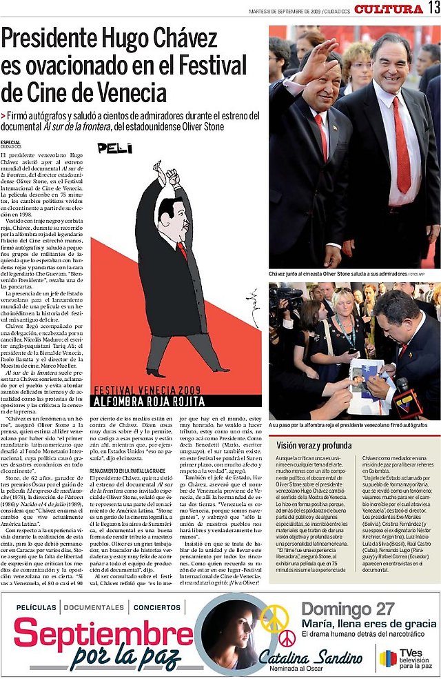 08 de septiembre 2009. - En un breve alto a su gira de política exterior, el presidente Hugo Chávez asistió ayer al estreno de la película Al sur de la frontera, del cineasta estadounidense Oliver Stone. Su presencia causó revuelo entre los asistentes al Festival de Cine de Venecia (Italia), que se volcaron a tomarle fotos y pedirle autógrafos como suele ocurrir con las estrellas cinematográficas.