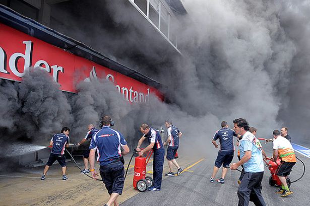 14 de mayo de 2012.- A tan sólo 90 minutos después de haber sido levantado en hombros por Fernando Alonso y Kimi Raikkonen en el podio del Gran Premio de España, Pastor Maldonado se vio obligado llevar a caballito, a su primo Manuel de 12 años de edad, a un lugar seguro cuando se desató un incendio en el garaje de la escudería Williams. Manuel tiene una bota de yeso en una de sus piernas, lo que le impidió moverse con rapidez, de allí la acción de Pastor.