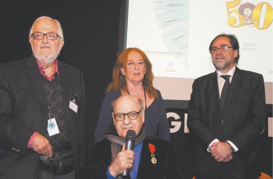 Ayer, en el espacio más grande del Salón de Paris, Grande Scéne, tuvo lugar "Rencontre avec Quino (Encuentro con Quino)", una entrevista pública a él y al humorista francés Zep. Al finalizar, el público podía hacer preguntas. Luego, en un acto formal que contó con la presencia del secretario de Cultura de la Nación Jorge Coscia, el embajador de Francia en la Argentina Jean Michel Casa le hizo entrega al humorista de la medalla de la Legión de Honor. El galardonado no se puso solemne para agradecer. Dijo que toda su vida había soñado con recibir la Orden de la Legión de Honor y con dibujar para Paris Match. Pero antes de eso, hizo reír a todo el mundo con sus respuestas desacartonadas.