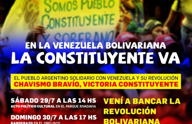 29 julio 2017 - Diversas organizaciones de Argentina se encuentran difundiendo una convocatoria a firmar en apoyo a la Asamblea Nacional Constituyente en Venezuela. Además, las organizaciones convocan a dos actividades: