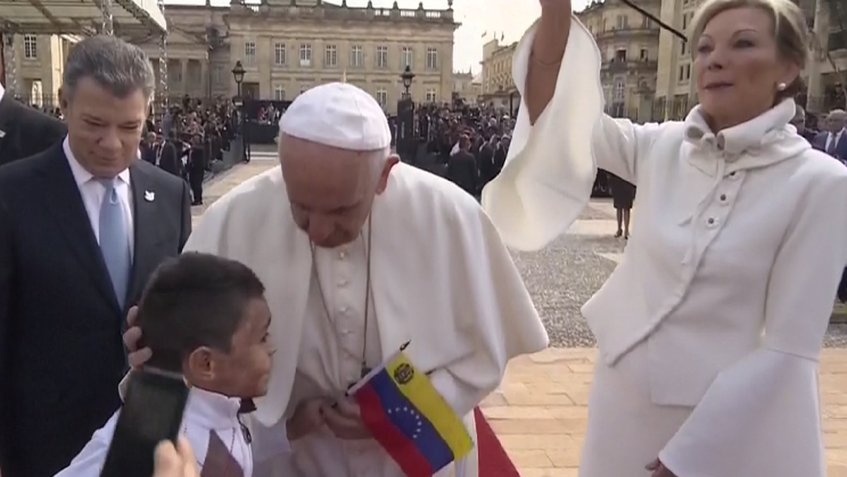 Bogotá, septiembre 7 - El papa Francisco fue sorprendido a su llegada a la Casa de Nariño en Colombia, cuando un niño corrió hacia él a abrazarlo y regalarle una bandera de Venezuela.