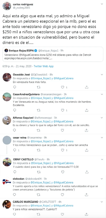 Por su parte, otros usuarios defendieron al grandes ligas, alegando que él había ayudado bastante a los venezolanos con su fundación en el país y que por tener muchos años viviendo en Estados Unidos era coherente que hiciera donativos ahí.