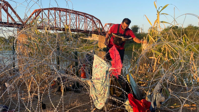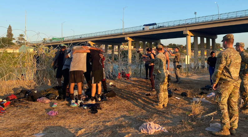 25-09-23.-Después de semanas de recorrer peligrosas rutas, cientos de venezolanos vivieron momentos agridulces este sábado al llegar a Eagle Pass, en la frontera de Estados Unidos con México, y encontrarse con un tupido enjambre de militares armados y alambre de púas.