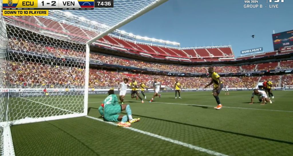 En el minuto 22, el delantero ecuatoriano Enner Valencia fue expulsado por el árbitro por su entrada tardía y peligrosa al defensa venezolano José Martínez. El disparo de John Yeboah desde dentro del área lo detuvo Romo y el Valencia quiso llegar al balón. Sin embargo, su desafío a Martínez fue tardío y peligroso. Le sacaron roja directa después de que el VAR pidiera al árbitro que viniera a echar un vistazo.