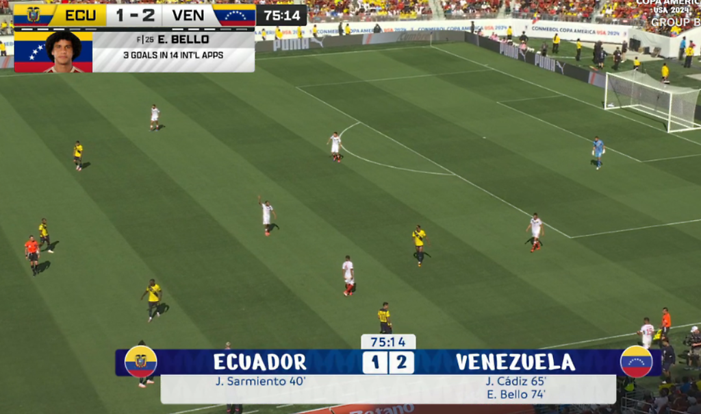 Eduard Bello selló la victoria de Venezuela en el minuto 74, al rematar un rebote desde corta distancia luego de que Rondón atajó con precisión el portero ecuatoriano Alexander Domínguez.