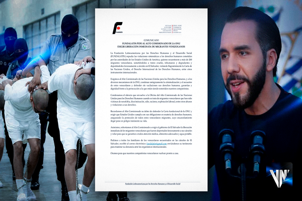 La Fundación Latinoamericana por los Derechos Humanos y el Desarrollo Social (Fundalatin) hace un llamado urgente al Alto Comisionado de las Naciones Unidas para los Derechos Humanos, exigiendo la liberación inmediata de más de 200 migrantes venezolanos detenidos ilegalmente en Estados Unidos y enviados a una cárcel de Nayib Bukele, en El Salvador.
