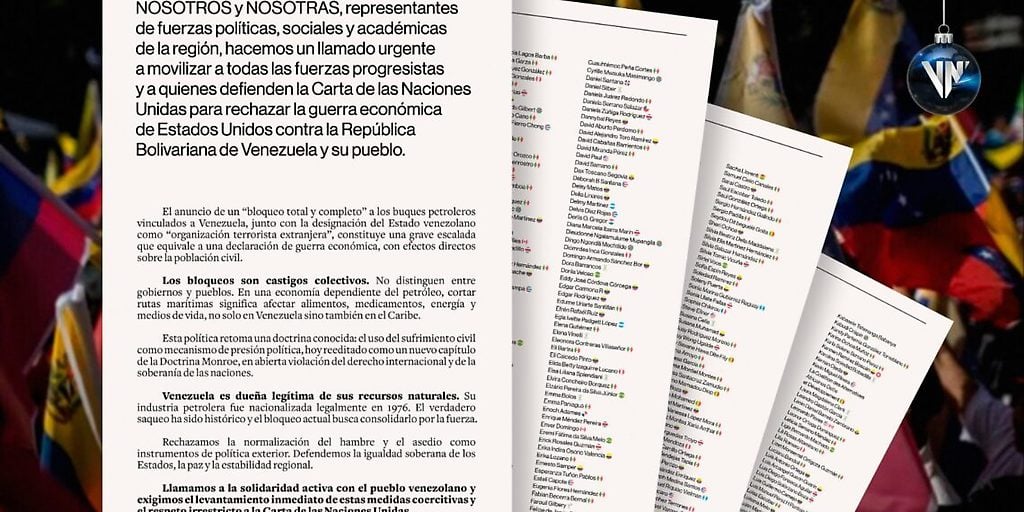 .Este miércoles, los líderes políticos, sociales y académicos de más de 20 países emitieron un comunicado conjunto donde llaman a movilizar a todas las fuerzas progresistas para rechazar la guerra económica de Estados Unidos (EEUU) contra Venezuela. Los firmantes calificaron el «bloqueo total» a buques petroleros y la designación del Estado como «organización terrorista» como una declaración de guerra económica.