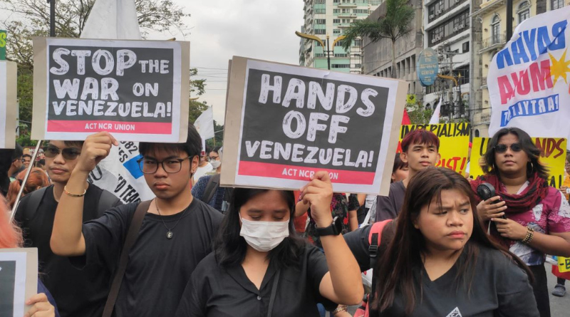 5 de enero de 2026.- En la avenida Kalayaan de Manila, cientos de ciudadanos filipinos participaron en una movilización para rechazar la agresión de Estados Unidos contra Venezuela y exigir la liberación del presidente de la República Bolivariana de Venezuela, Nicolás Maduro Moros y la primera dama Cilia Flores, quienes fueron secuestrados por fuerzas estadounidenses el pasado 03 de enero.